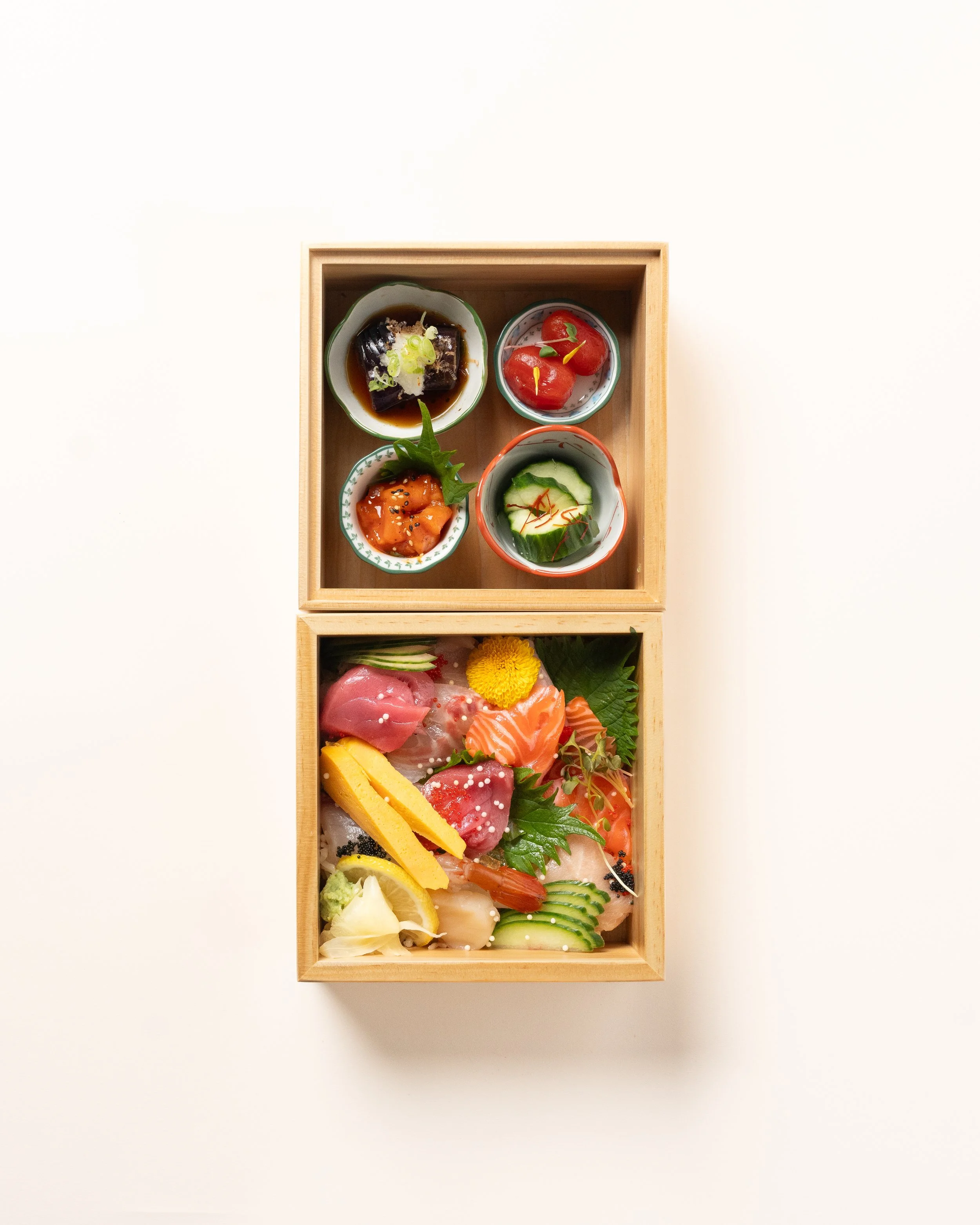 sushi rice topped with assorted seasonal sashimi, accompanied by a rotating selection of four seasonal side dishes