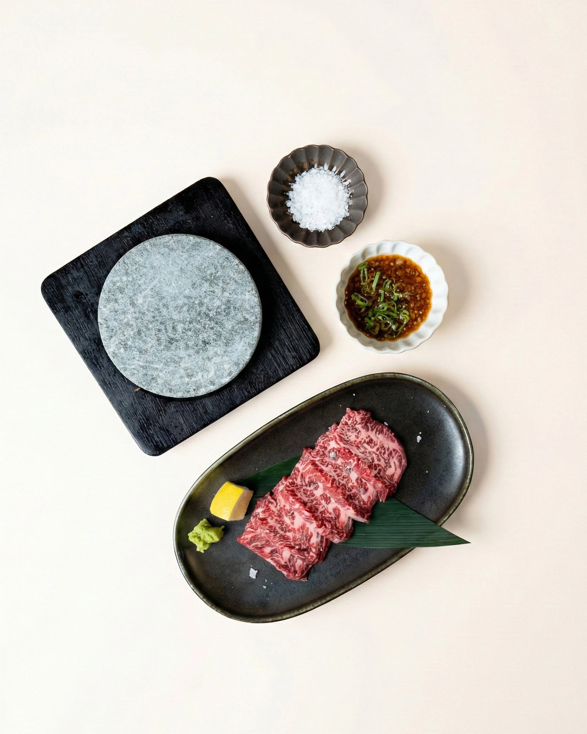 thinly sliced Brant Lake wagyu, served with ponzu oroshi, sea salt, fresh lemon, and wasabi, served with hot stone