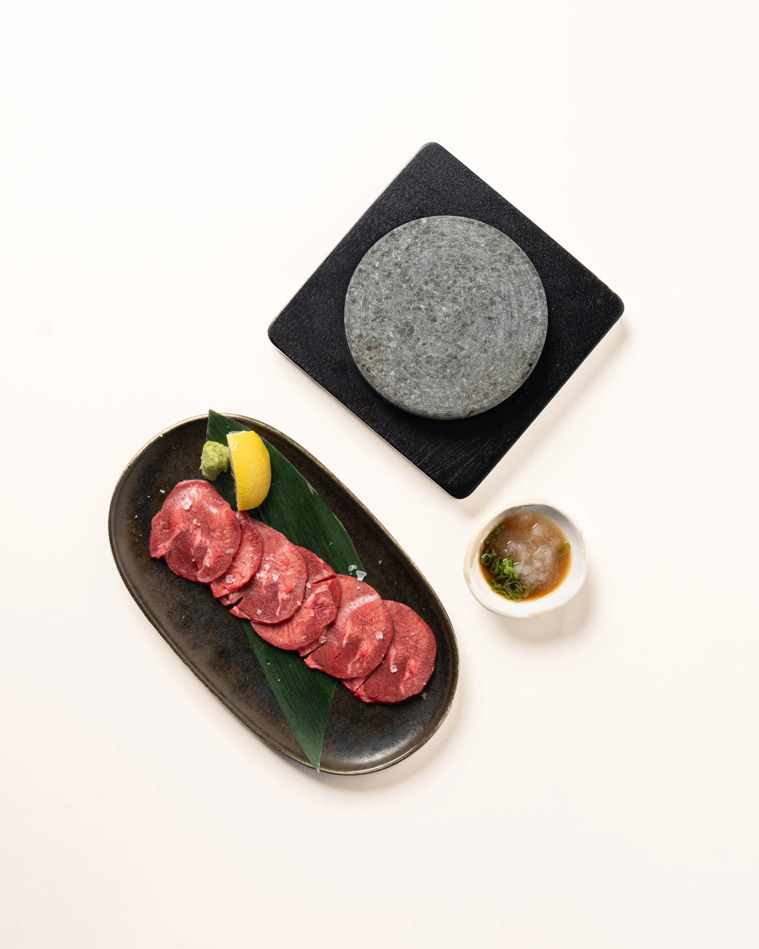thinly sliced Brant Lake wagyu tongue, served with ponzu oroshi, sea salt, fresh lemon, and wasabi, served with hot stone