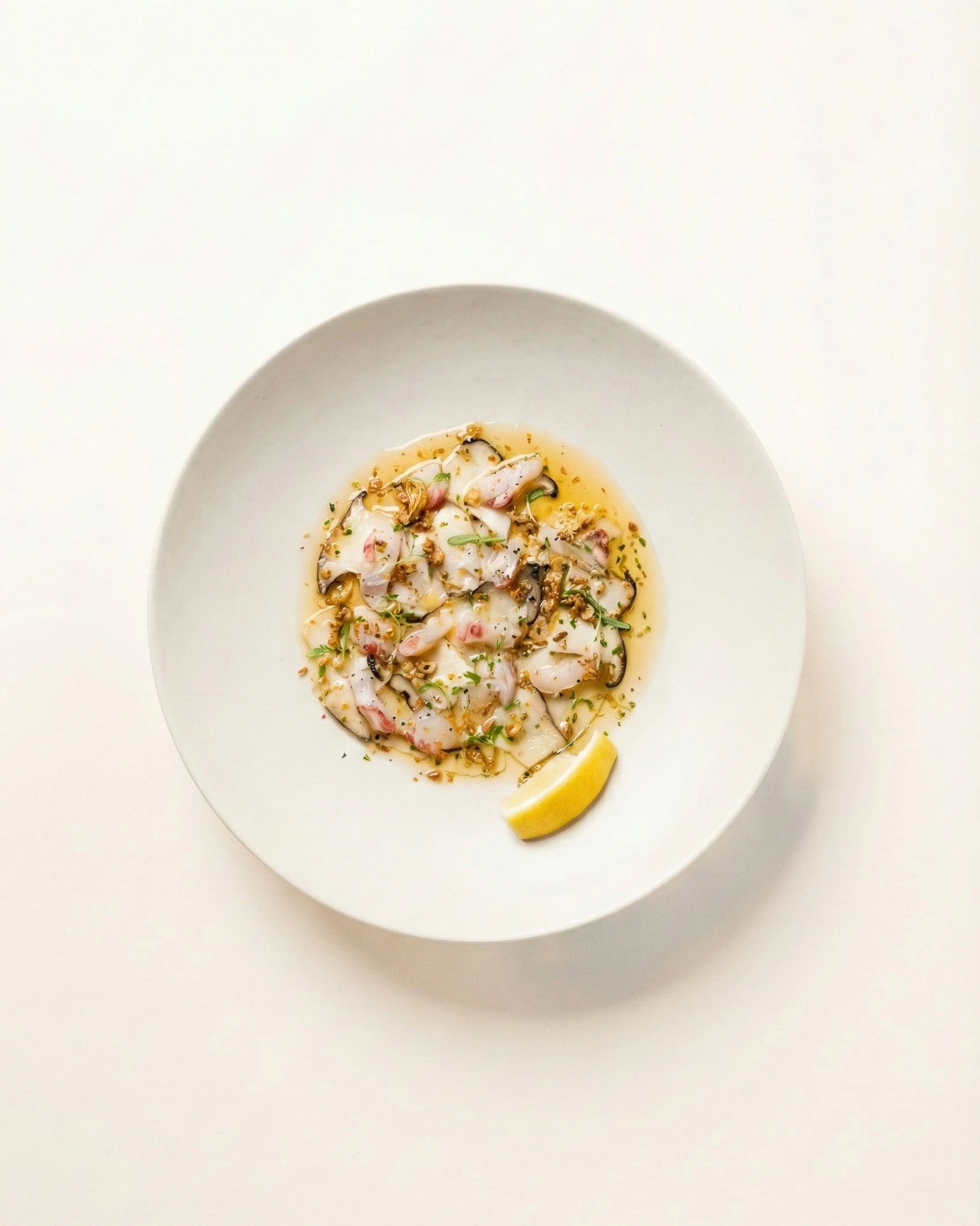 boiled thinly sliced oyster mushroom, topped with madai, dressed in yuzu soy vinaigrette, finished with crispy onion and micro cilantro