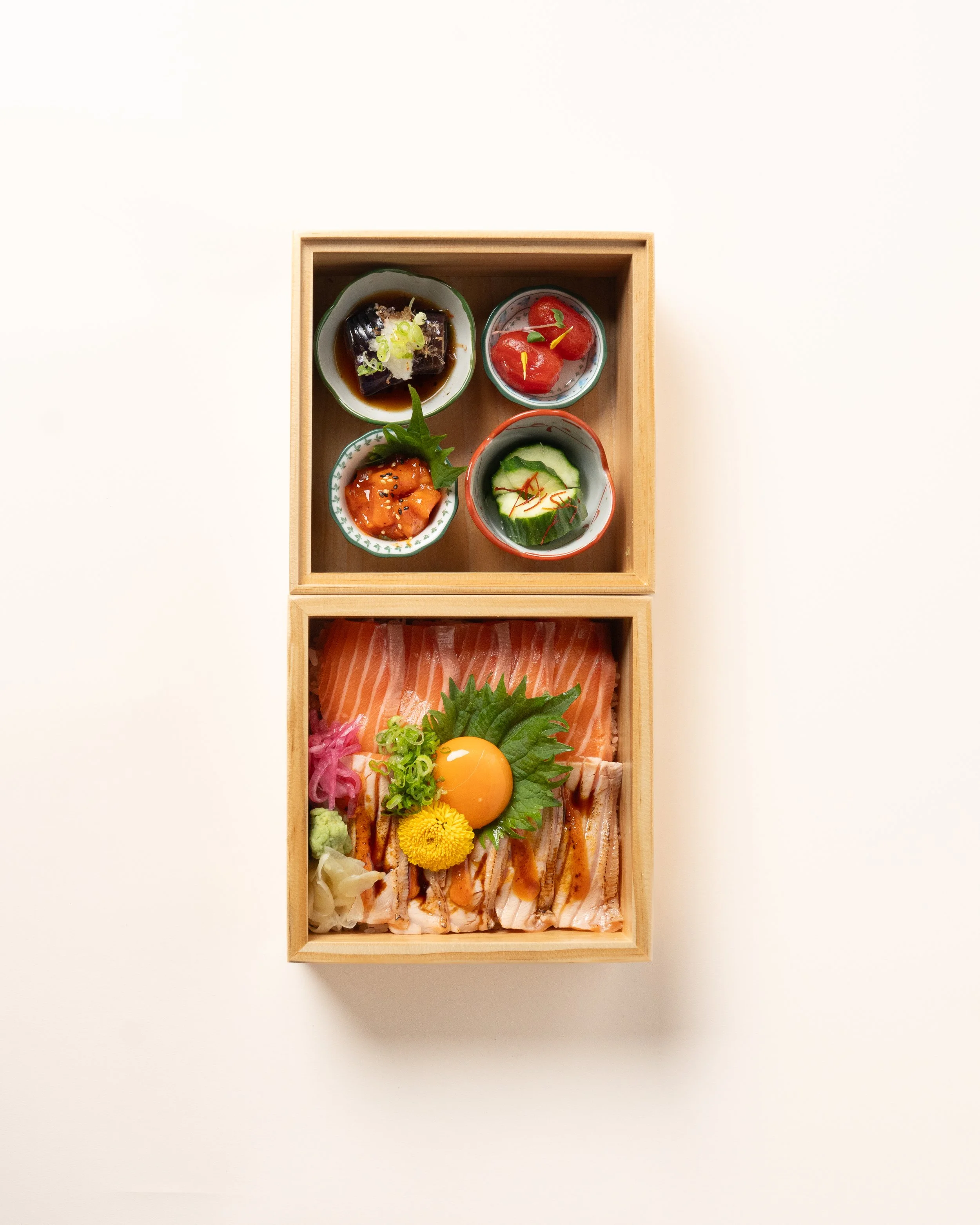sushi rice topped with fresh and spicy mayo aburi (torched) salmon, nitsume, egg yolk, served with a rotating selection of four seasonal side dishes