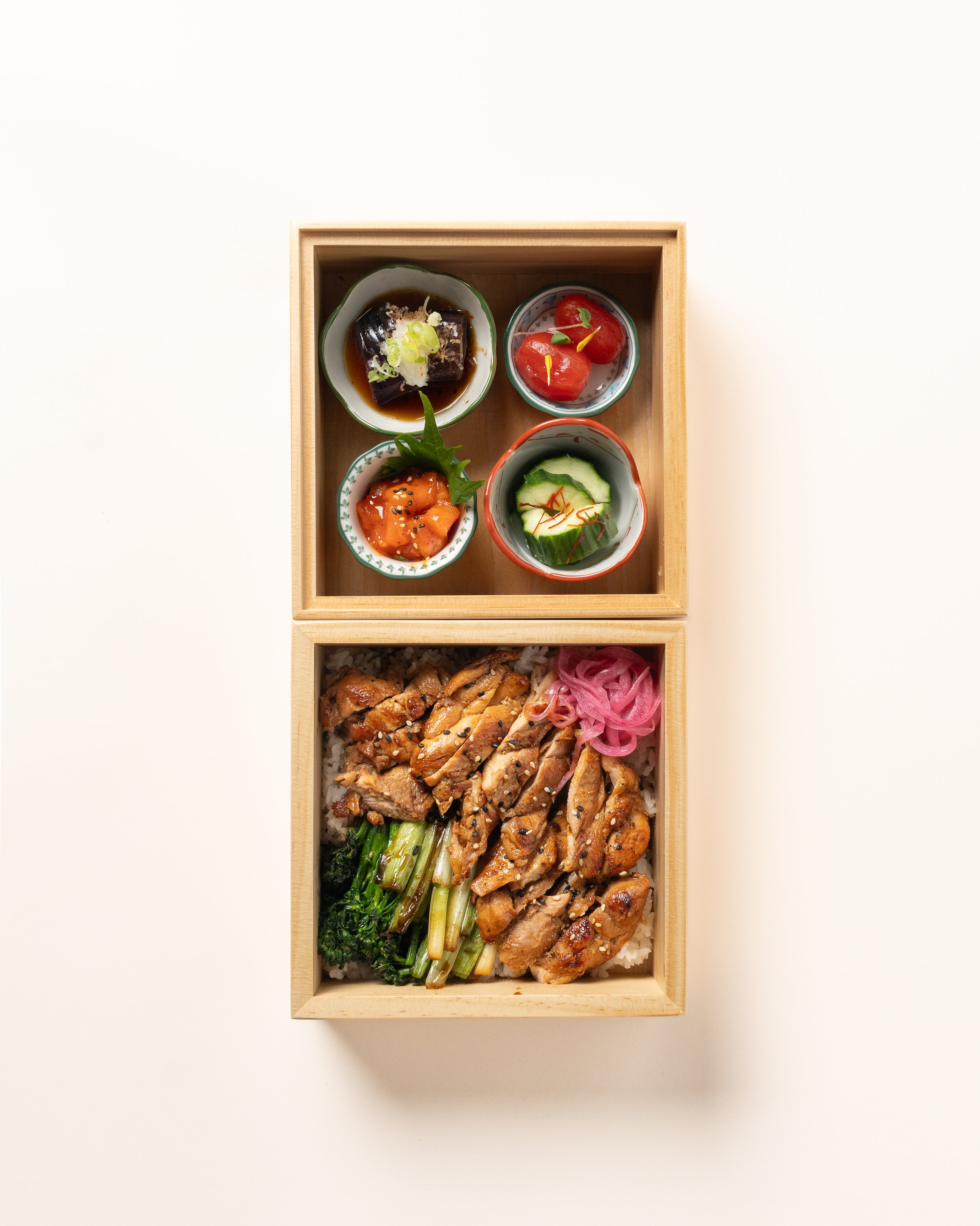 a two-box set featuring grilled chicken glazed with house-made teriyaki sauce over rice, topped with grilled vegetables, pickled onion, and sesame seeds, served with a rotating selection of four seasonal side dishes